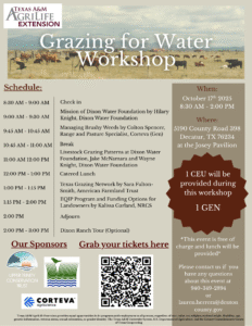 The ‘Grazing for Water’ workshop will be held on October 17th at Dixon Water Foundation’s Josey Pavilion at 5190 County Road 398, Decatur, Texas. Attendees will learn about:
